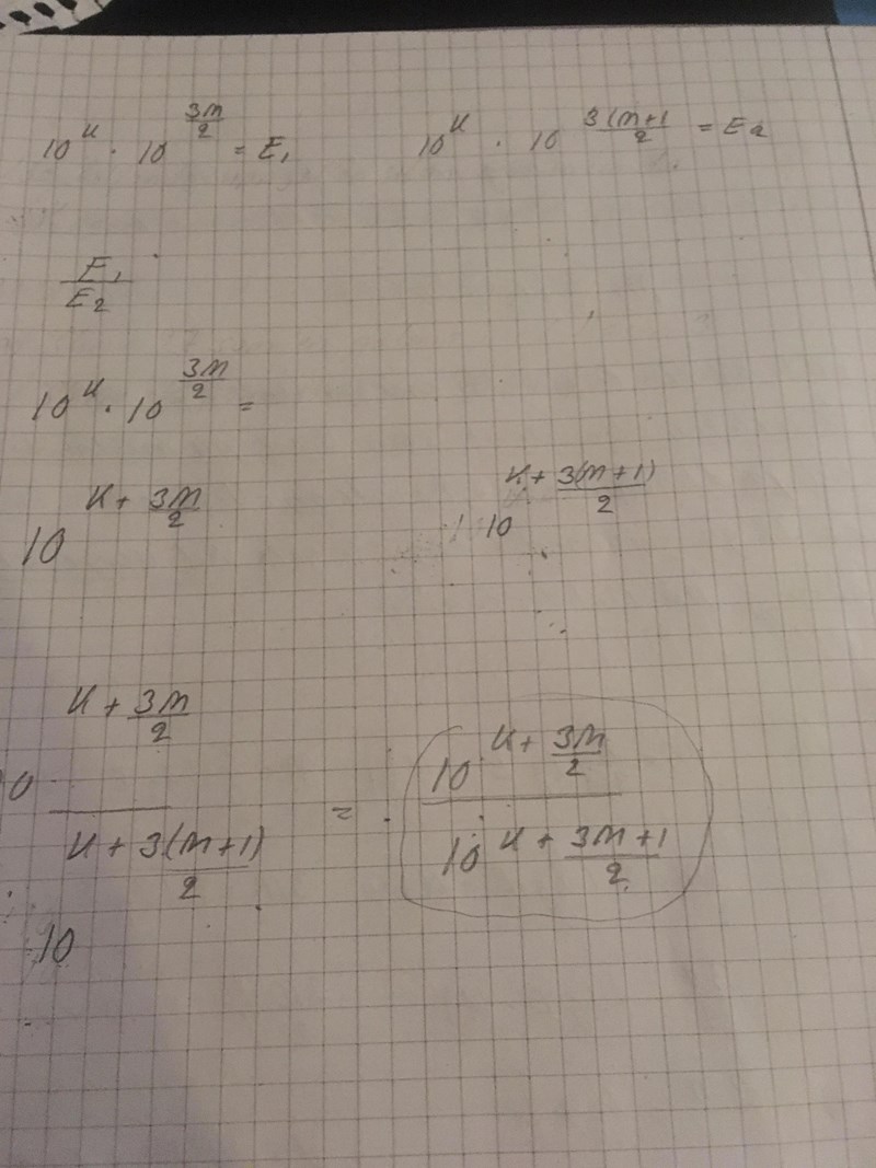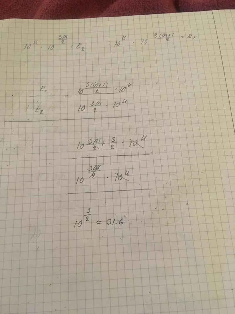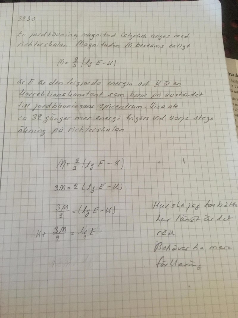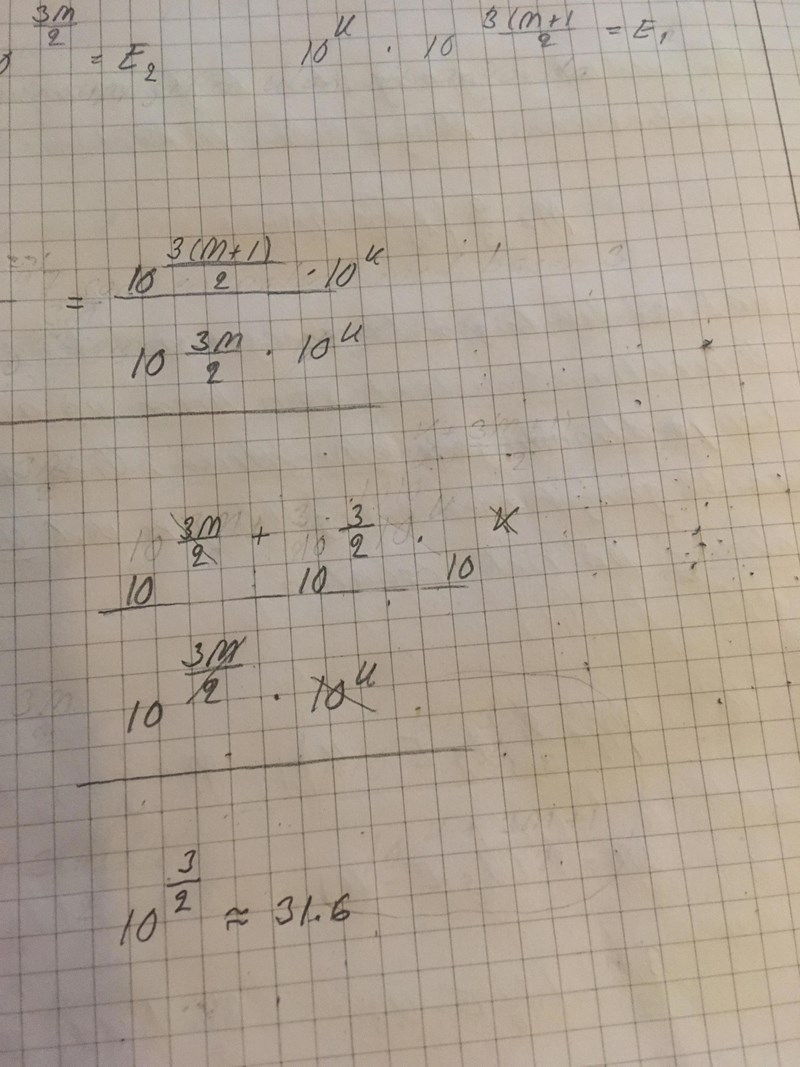 Nu vill du räkna ut M2 - M1 (M2-M1 = ... - ...), och sedan få en E2/E1-term på ena sida för att därmed kunna visa hur många gånger större E2 är än E1. Du borde få ett svar som är 31.6227...