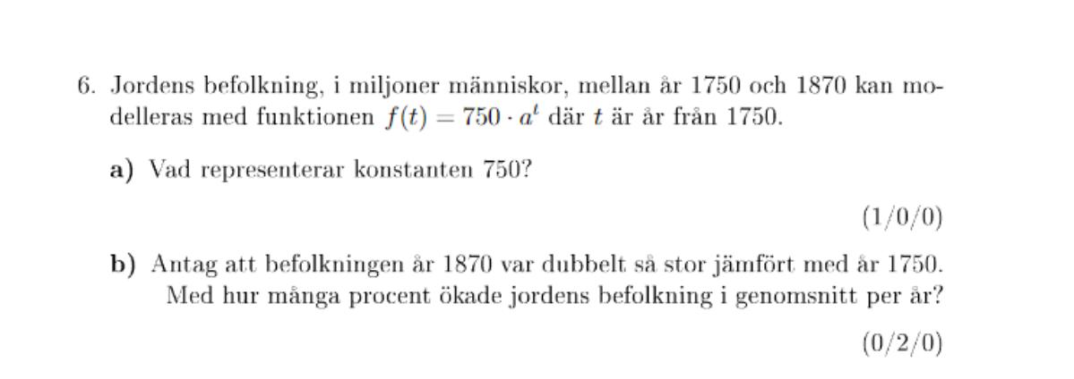 AlexMu skrev:Mellan 1750 och 1870 har det gått 120 år, ja och befolkningen ska dubblas under denna tid. Då får du ekvationen