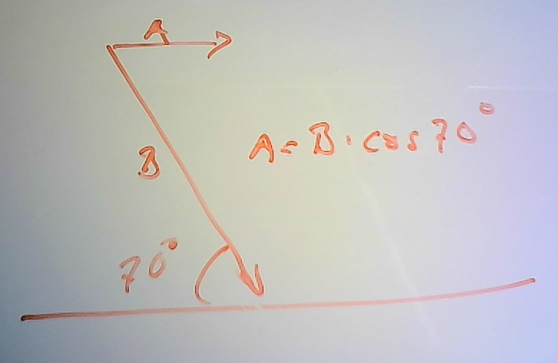 Så ur bilden ovan får vi att den horisontella komposanten A = B*cos(71) (jag råkade skriva 70 i bilden)