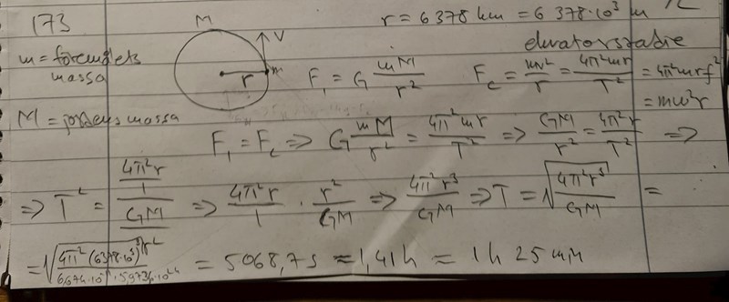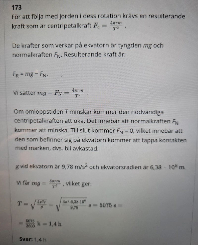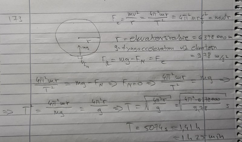 Och man kan kritisera facit lite för att det redan finns en rotationsperiod på 24 timmar som påverkar värdet av g vid ekvatorn.