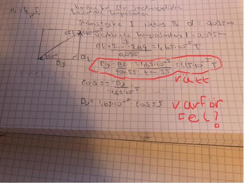 Uppågiftslydelsen var att man ska beräkna den kompsant från jordens magnetfält som påverkar kompassnålen . ja har strömmen som gick i kretsen den var 2,89 A avståndet från ledaren till kompassen var 0,035 meter och vinkeln ar 55 grader mot horisontalplanet( x-axeln) magnetfältet från jorden vill dra kompasssen åt norr och magnetfältet från ledaren vill dra nålen åt öster, kompassen ställer in sig åt nordost. Ja förstår trigonometrin och alltihop angående uppgiften och de sambandet som du hänvisade till, nämligen cot(x)=