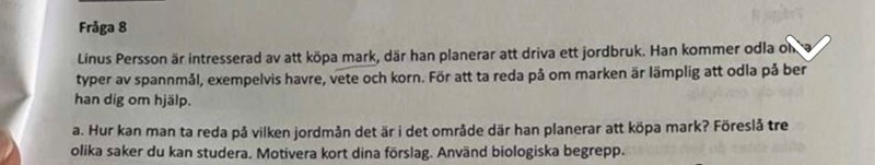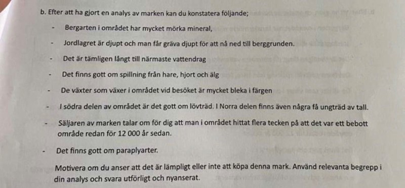 På fråga b) har de nu gett information om marken som Linus Persson vill köpa. Du ska utifrån information avgöra om marken är bra för odling eller inte.
