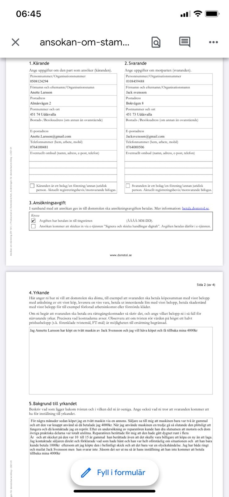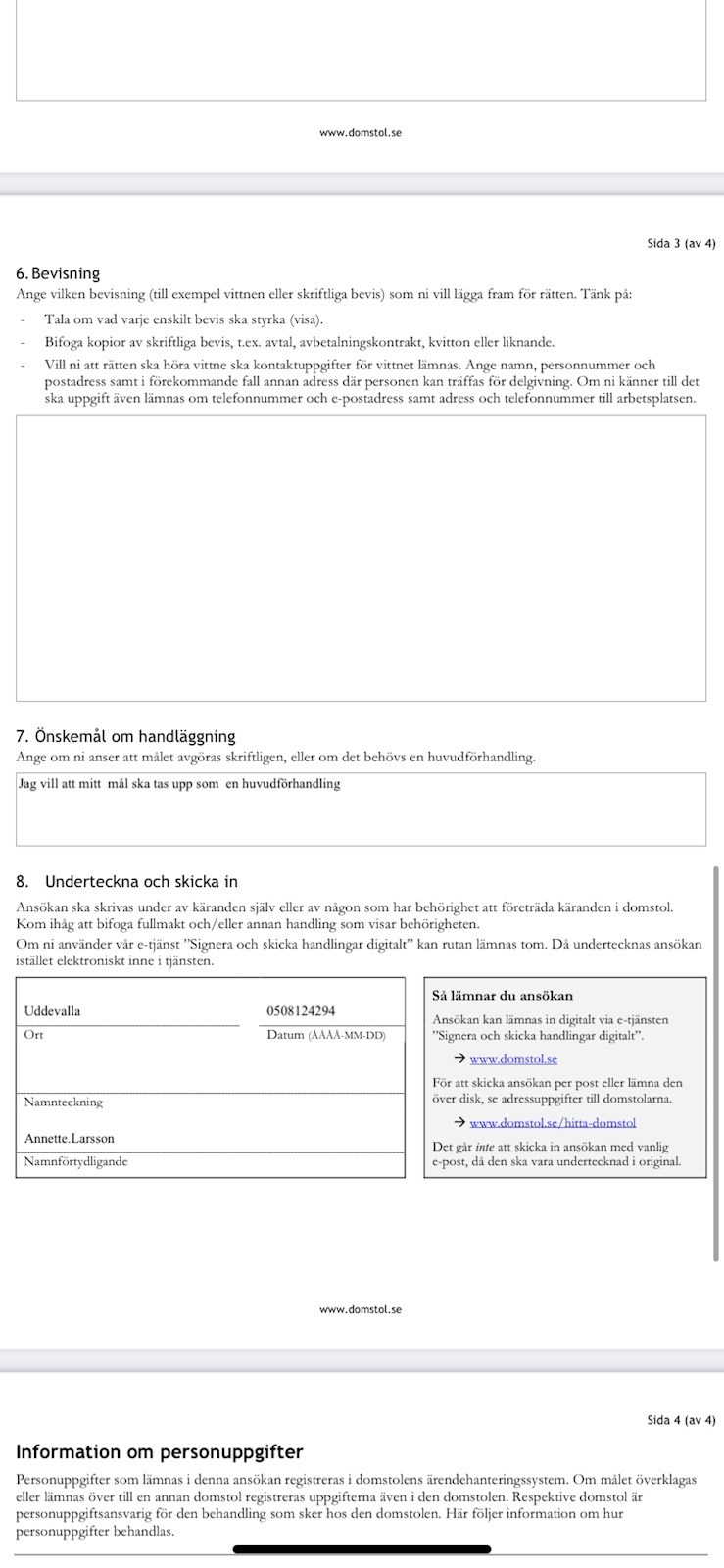 Hej jag har skrivit en stämningsansökan men vet inte om jag har gjort helt korrekt skulle någon kunna hjälpa mig.?
