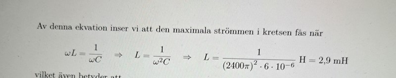 Sedan ser vi att vi får max-ström då nämnaren blir minimum vilket den blir då .
