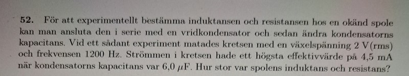 Jag förstår inte varför facit använder sig av wL=1/wc för att hitta L (induktansen) och vad de menar med att strömmen är maximal om bådas impedanser är lika. Jag har också ställt upp jw metoden precis som dem men fastnade när jag insåg att vi har två obekanta i vår ekvation.