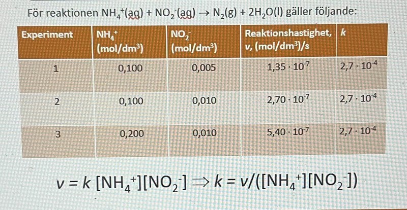 Gör en enhetsanalys! är en hastighet som beskriver hur snabbt koncentrationerna ändras, dvs enheten är mol/(dm3 s). Koncentrationer har enheten mol/dm3. Vad måste då ha för enhet?