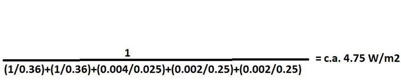Jag började med att räkna ut K-värdet med formeln k = 1/((1/Värmeövergångskoefficienten på den varma sidan)+(1/Värmeövergångskoefficienten på den kalla sidan)+(Tjocklek lager 1/Värmeledningsförmåga lager 1)... osv med de andra 2 lagerna (d.v.s. mattan och den andra väggen plast).