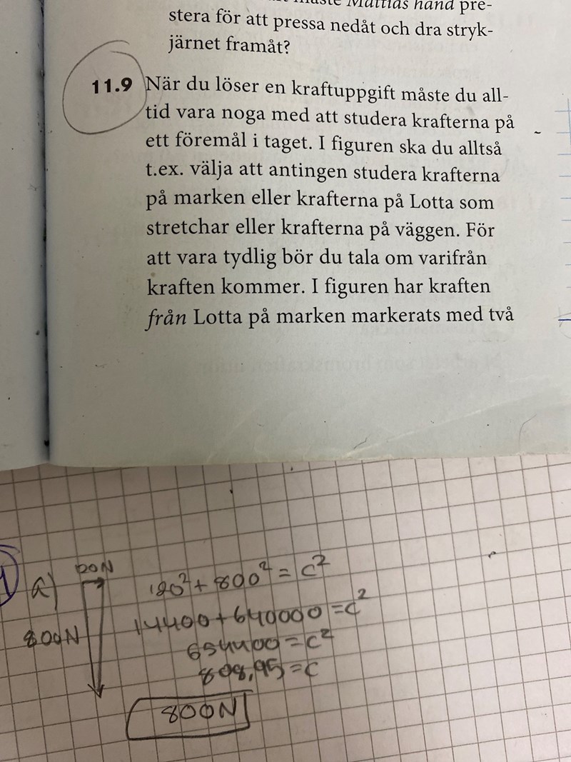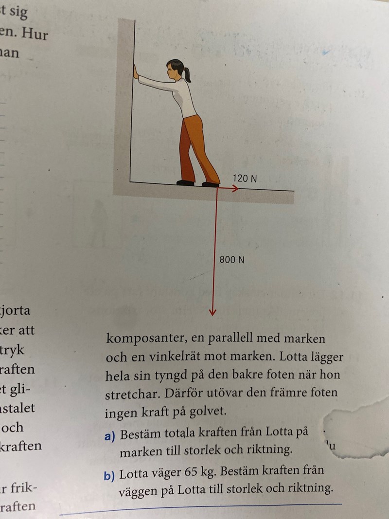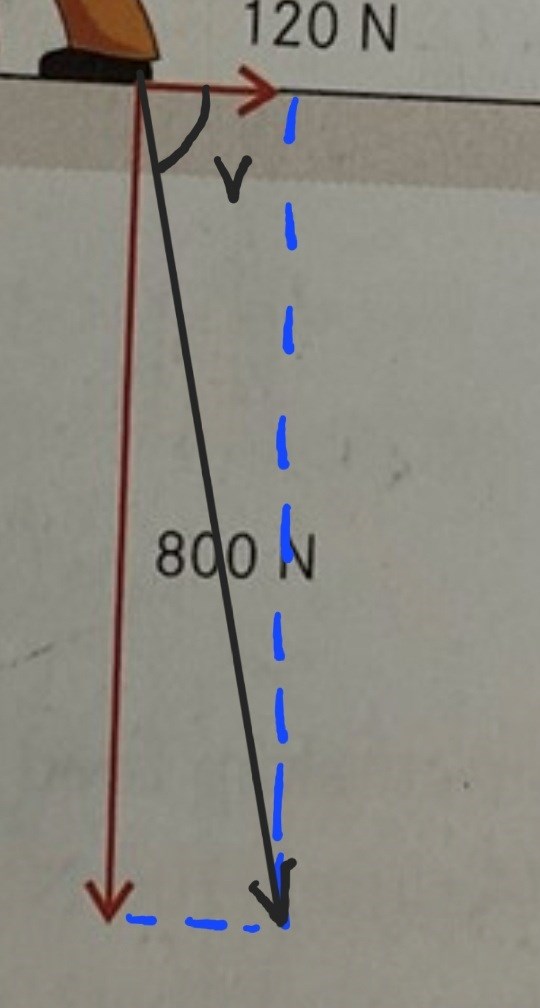 Du kan använda ett trigonometriskt samband för att få fram vinkeln v mellan den resulterande kraften och golvet, se bild.