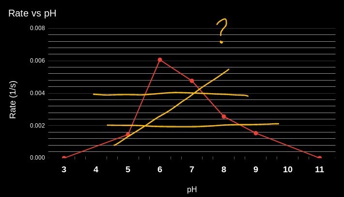 För pH 3 och 11 förstörs enzymt totalt, men för lite högre pH där hastigheten var mycket lägre, har det med att substansmängden icke-denaturerade enzym har minskat rejält, eller att det finns någon som gör de långsammare? Jag lutar åt det första, för jag tänker mig att antingen fungerar enzymet eller så gör det inte. Korrekt? Själv är jag osäker.