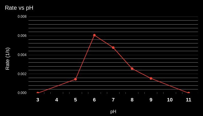 pH 3, 4, 5, 6, 7, 8, 9, 10 och 11 testades. Under laborationen landade experimentet i att jag försökte hitta vilket pH som enzymaktiviteten var som störst genom reaktionshastighet.