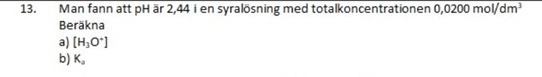 Ka = , och vi vet vad H+ är. Den totala koncentrationen kan bidra med att vi löser vad syrans koncentration är genom enkel subtraktion, men hur räknar vi ut syrajonens koncentration?
