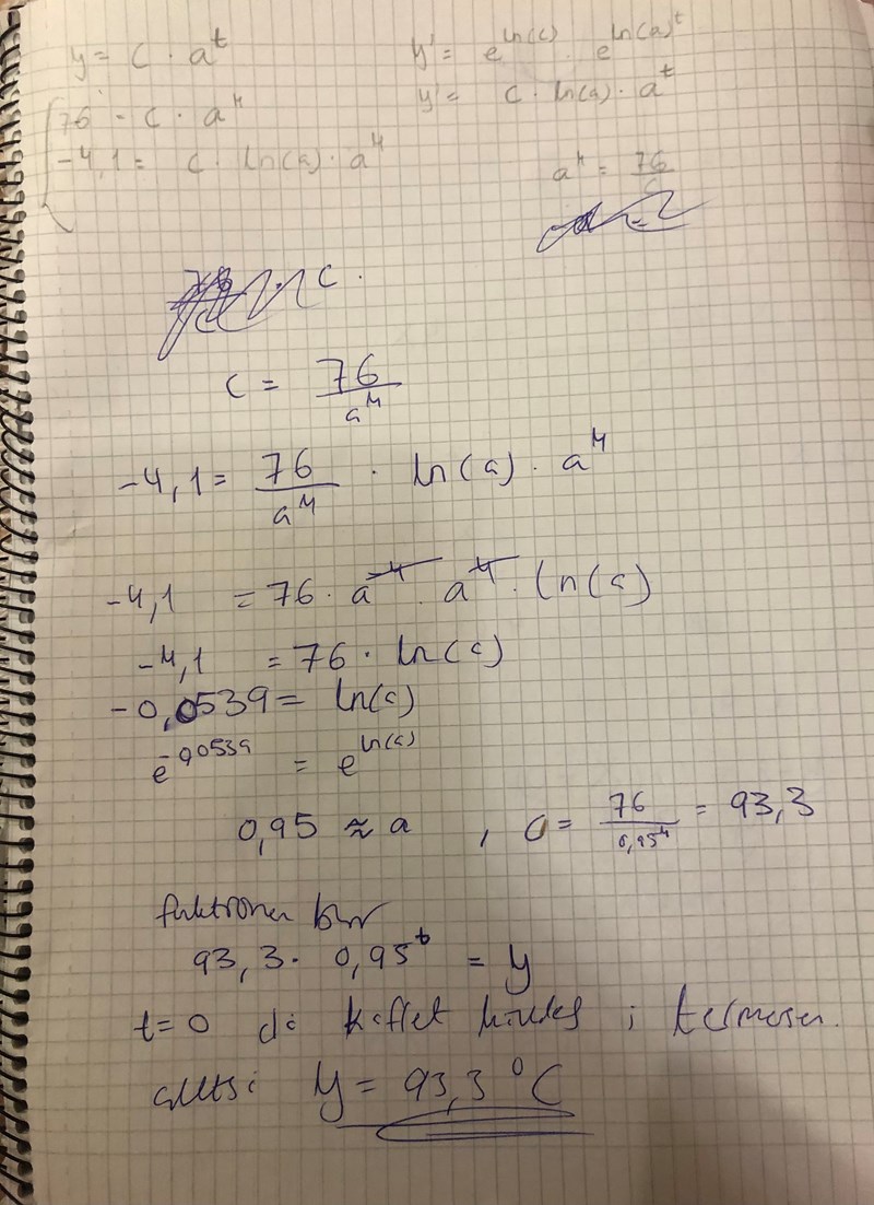 En termos fylls med hett kaffe och placeras direkt utomhus där temperaturen ligger kring noll grader. Temperaturen på kaffet avtar exponentiellt med tiden. Efter 4 timmar är temperaturen 76 grader och vid samma tidpunkt minskar temperaturen med hastigheten 4.1 grader per timme.