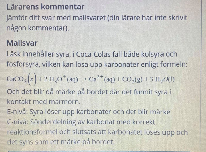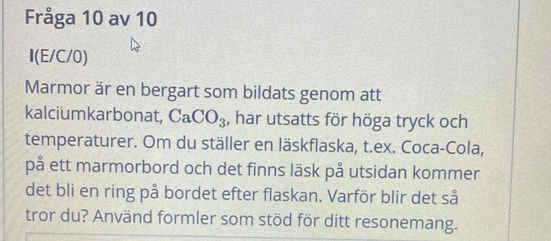 Jag tycker att frågan förutsätter lite väl mycket. Det borde stå t ex "så kommer det att bildas gasbubblor och så småningom blir det ett fult märke på bordet". Då skulle man ha haft en hyfsad chans att förstå att det bildas koldioxid, och då kan man komma fram till rätt formel.