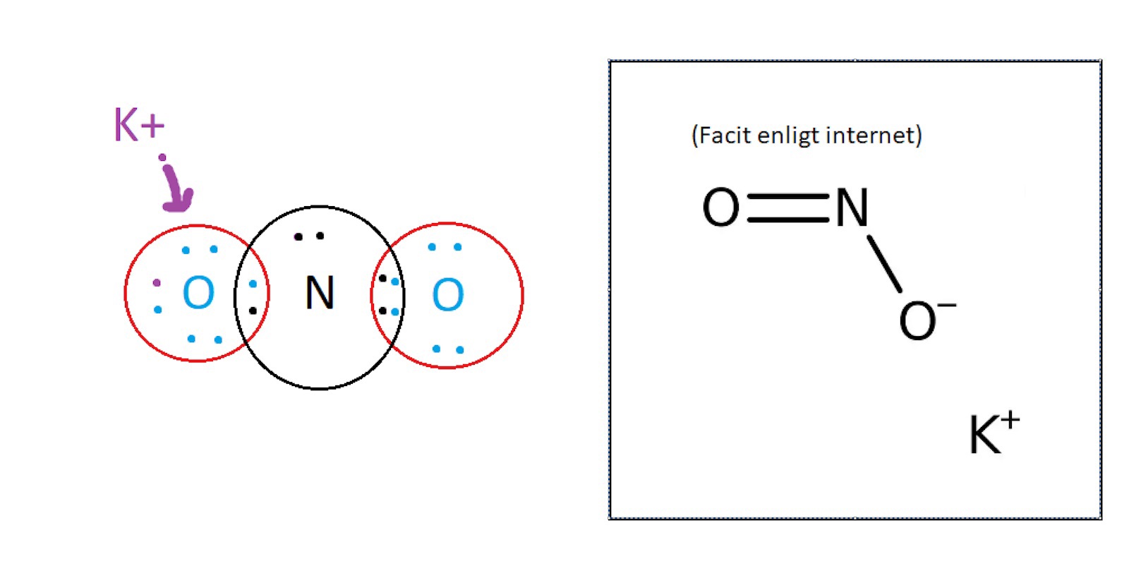 Efter att jag tog reda på att det är en dubbelbindning mellan en av syreatomerna och kvävet så gick det tillslut ihop, och att slutgiltiga formeln blir KNO2 där laddningarna är [K]+ [NO2]- däremot visar internet att den delen med enkelbindningen är den som blir negativ. Borde det inte bli tvärt om?