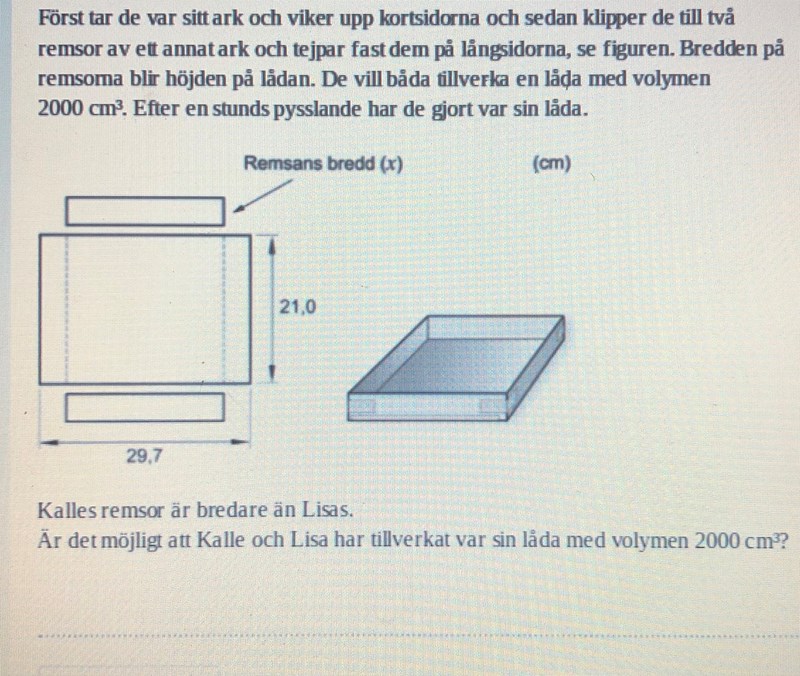Om du får 2 positiva svar när du löser den ekvationen finns det 2 olika lådor som kan tillverkas med samma volym.