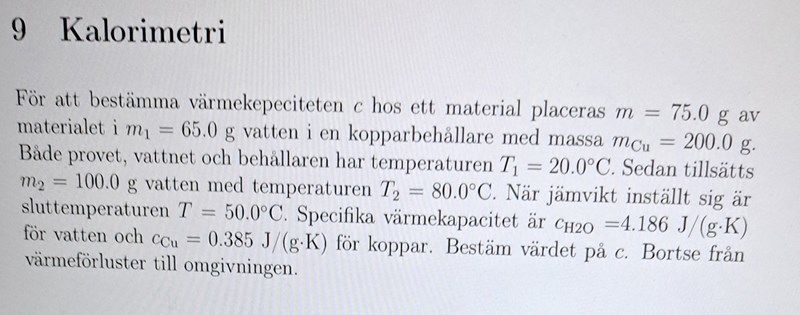 Smaragdalena skrev:Oj, jag glömde att 200 g koppar också skulle värmas upp från 20 oC till 50 oC.