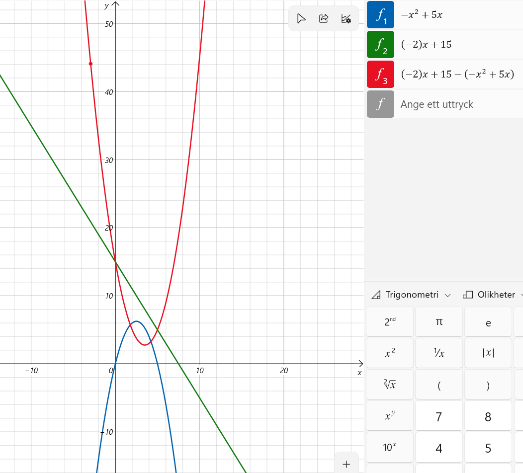 3218a) f(x) = -x^2 + 5x och g(x) = -2x + 15. Bestäm avståndet A mellan kurvorna i y-led som en funktion av x.