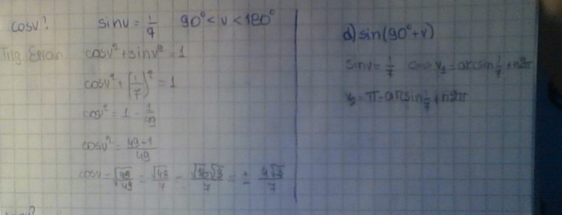 Hej igen! Här vet vi att sinv= 1/7 och att v ligger mellan 90 och 180 grader.