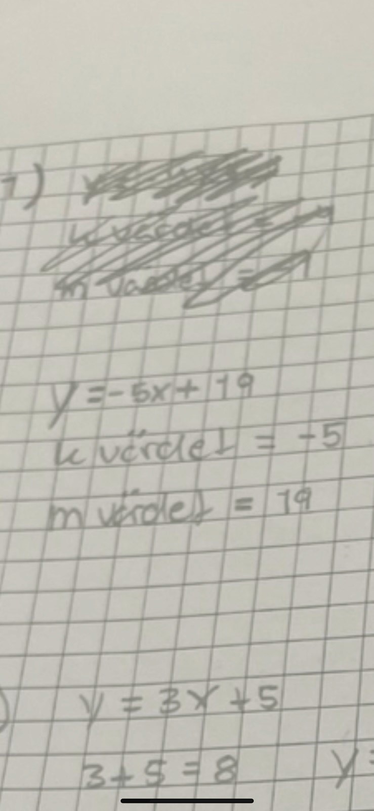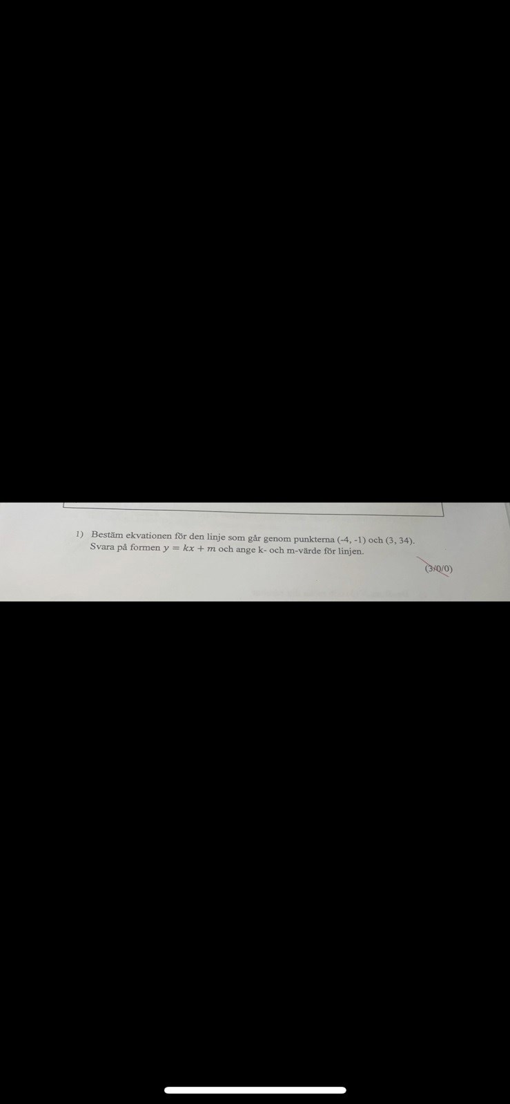 Bestäm den ekvationen för den linje som går genom punkterna (-4,-1) och (3,34). Svara på formel. Y=kx+m och ange k och m värde för linjen.