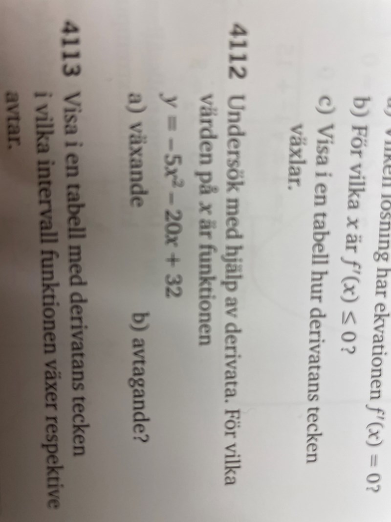 Jag försöker lösa denna uppgift: (4112). Så jag skriver först derivatan, y’=-10x-20 och ställer den som en olikhet då den är större än noll för att lösa när den är växande.