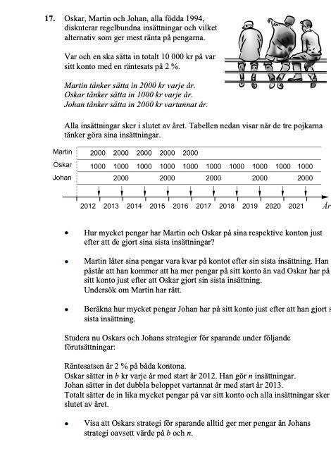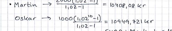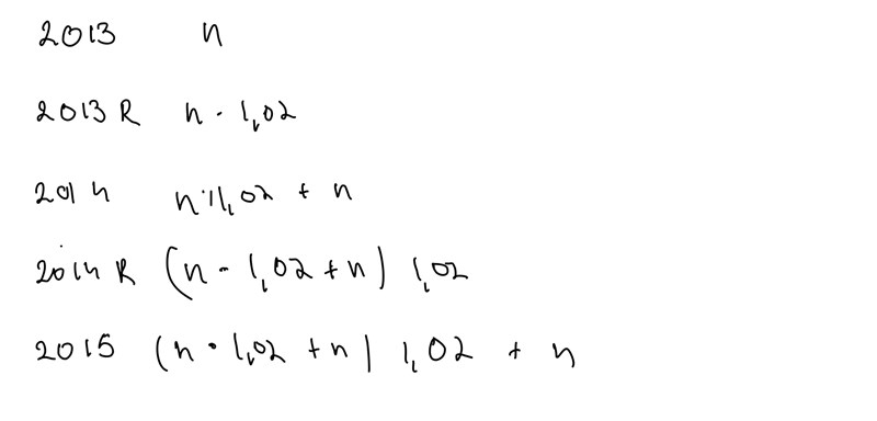 Om du multiplicerar in faktorn 1,02 i parentesen får du (för 2015) n.1,022+n.1,02+n eller n.1,022+n.1,021+n.1,020. Ser du att det är en geometrisk summa? Vilken formel använder man för att beräkna en geometrisk summa?
