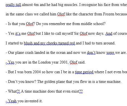 Me, Sara and the pilot walked to the emergency door. Sara opened the door and there were a huge pressure on my ears. I hold Sara’s hands and then we jumped out of the plane. I was screaming insanity i 10 minutes. We pulled out our parachutes and then we finally reached the ground. We saw the golden plane crashing into the ocean.