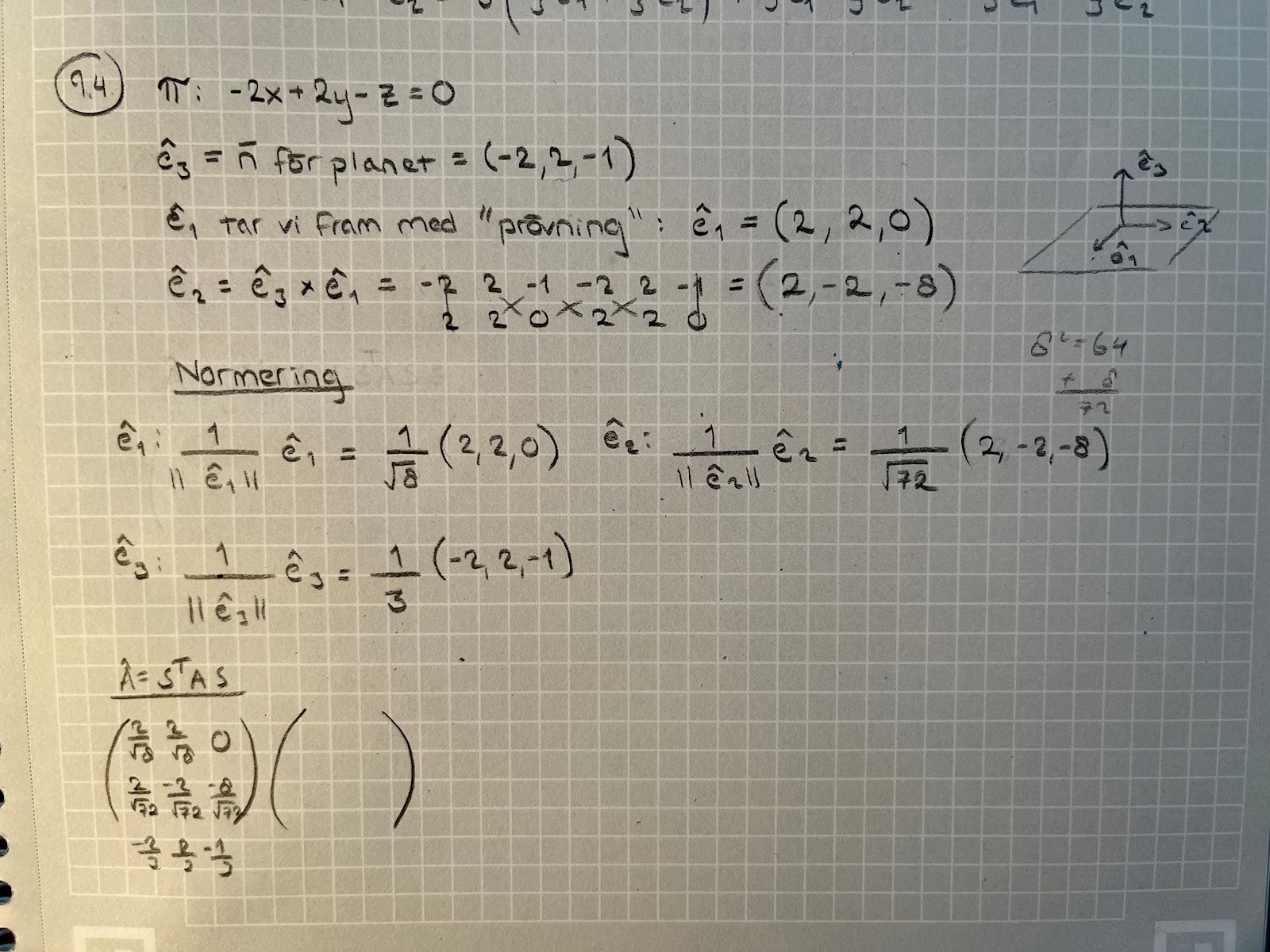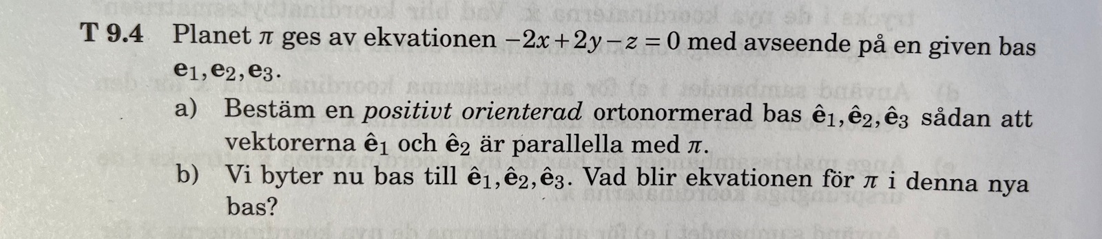 Okej, jag ser på bilden att i min nya ortonormerade bas är ê1 och ê2 parallella med planet, medan ê3 är ortogonal mot planet.
