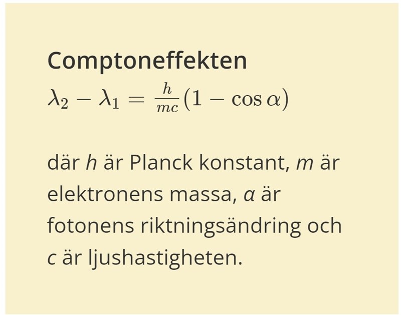SeriousCephalopod skrev:Comptonspridning är för elastiska stötar så liknelser med fordon kommer alltid att vara lite otillräckliga. Vidare så fotoner kan aldrig helt stanna upp då de har konstant fart oavsett om de deflekteras vilket är varför deras våglängder förskjuts istället för att deras fart förändras.