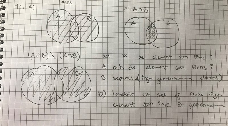 Jag ritade upp ett venndiagram och det tänkte jag att man kan beskriva venndiagramet som "alla de element som finns i A och alla de element som finns i B separat (inga gemensamma element)." Jag undrar om jag har tänkt rätt?