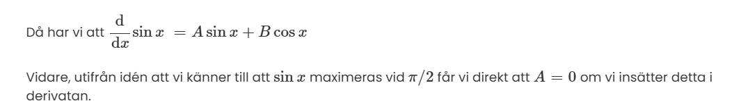 Vidare, utifrån idén att vi känner till att maximeras vid får vi direkt att om vi insätter detta i derivatan.