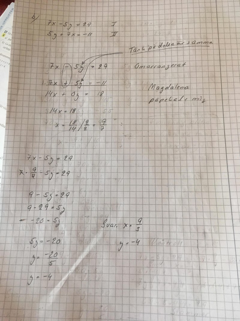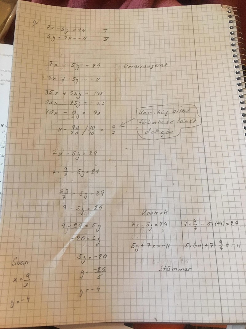 Päivi skrev :Jag försökte göra detta med substituons metoden, men fick på direkten fel och därför bestämde jag mig använda additions metoden . Jag kan inte förstå att det blev så.