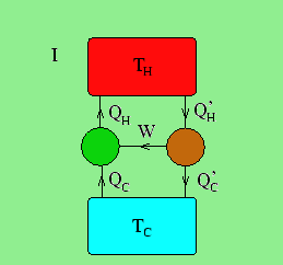 Antag att vi kopplar ihop en Carnotpump med en (eventuellt irreversibel) väremotor enligt figur: