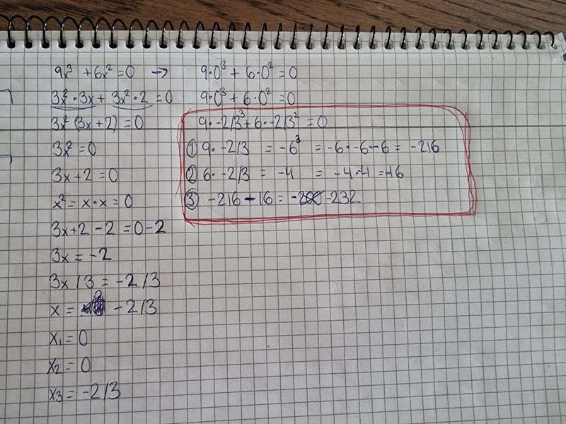 det blir inte 0. hur kan -2/3 passa in i 9x^3+6x^2=0?