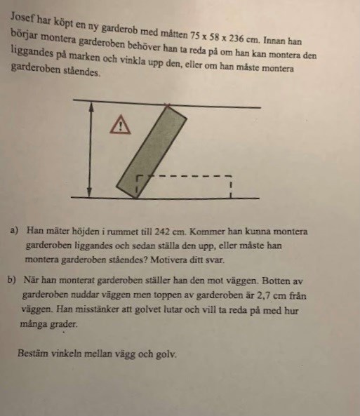 Josef har köpt en ny garderob med måtten 75*58*236 cm. Innan han börjar montera graderoben behöver han ta reda på om han kan montera den liggandes på marken och vinkla upp den eller om han måste montera garderoben ståendes.