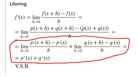 Mogens skrev:Du menar att f(x) = p(x) + q(x) och så ska man visa att f’(x) = p’(x) + q’(x) ?