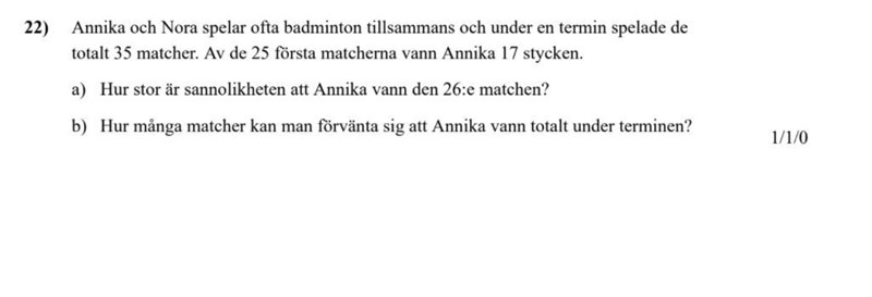 Utfallet för vinst för Annika de 25 första matcherna, relativ frekvens, är , dvs 68%