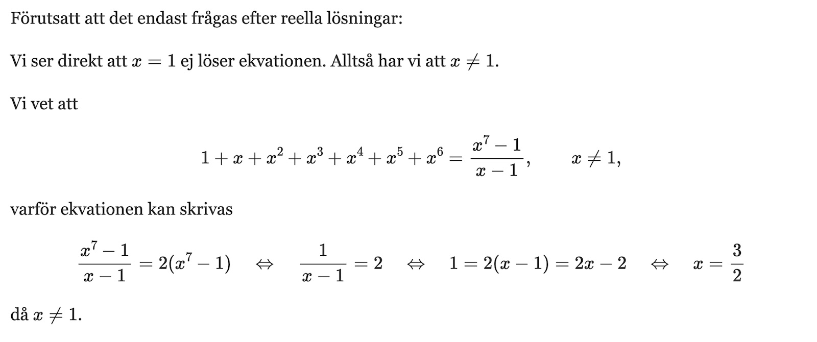 Nu vet du att vänsterled är en geometrisk summa. Försök ställa upp den och lösa ekvationen för x.