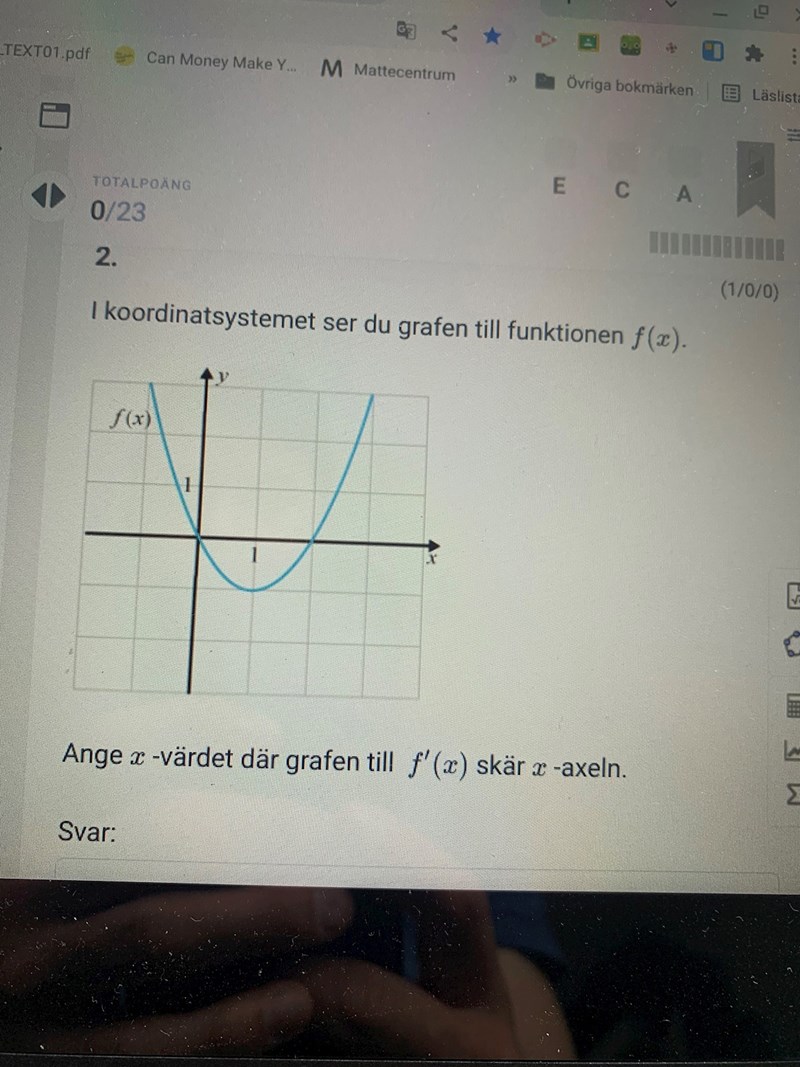 Skär x-axel är samma sak som att den är 0. Hur kan du se var derivatan är 0?