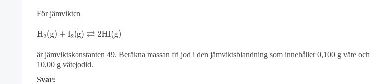 Börja med att räkna ut hur många mol väte respektive jod det finns vid jämvikt. Skriv också uttrycket för jämviktskonstanten.