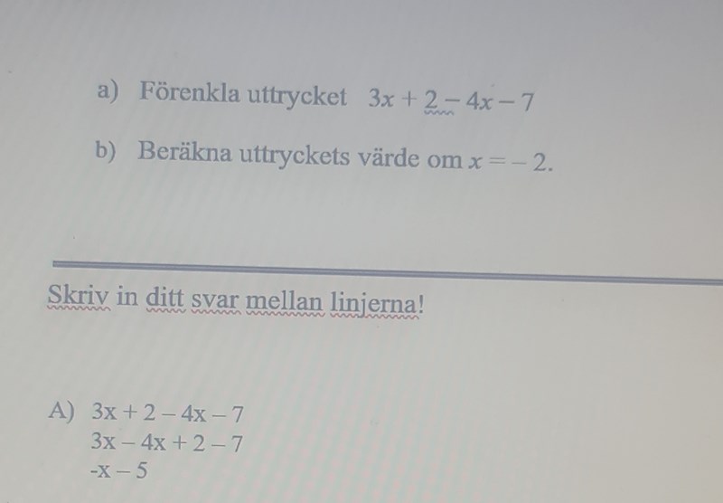 Det ser rätt ut. Om du hade förenklingen från a) så hade det varit enklare att beräkna b) genom att bara sätta in -2 i det förenklade uttrycket -x - 5: -(-2) - 5= 2 - 5= -3
