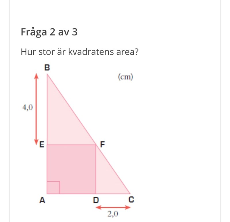 Trianglarna BEF och FDC är likformiga. Antag att kvadraten har sidan x. Vet du hur du går vidare sedan?