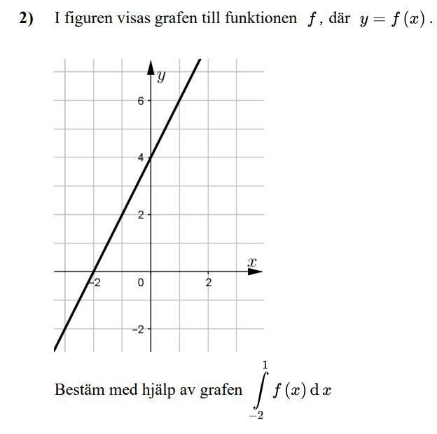fastpaB skrev:Genom att kolla på grafen som är på formen y = kx + m så kan du lista ut vad funktionen är. Då ställer du upp (med ditt k och m värde) och då kan du räkna ut intregralen
