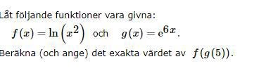 jag pluggade in 5 in i de båda och fick 3.218 för ln(upphöjt i 2) och 1.068e13 för e upphöjt i 6x5. ska jag ta båda av dom gånger varandra eller vadå?