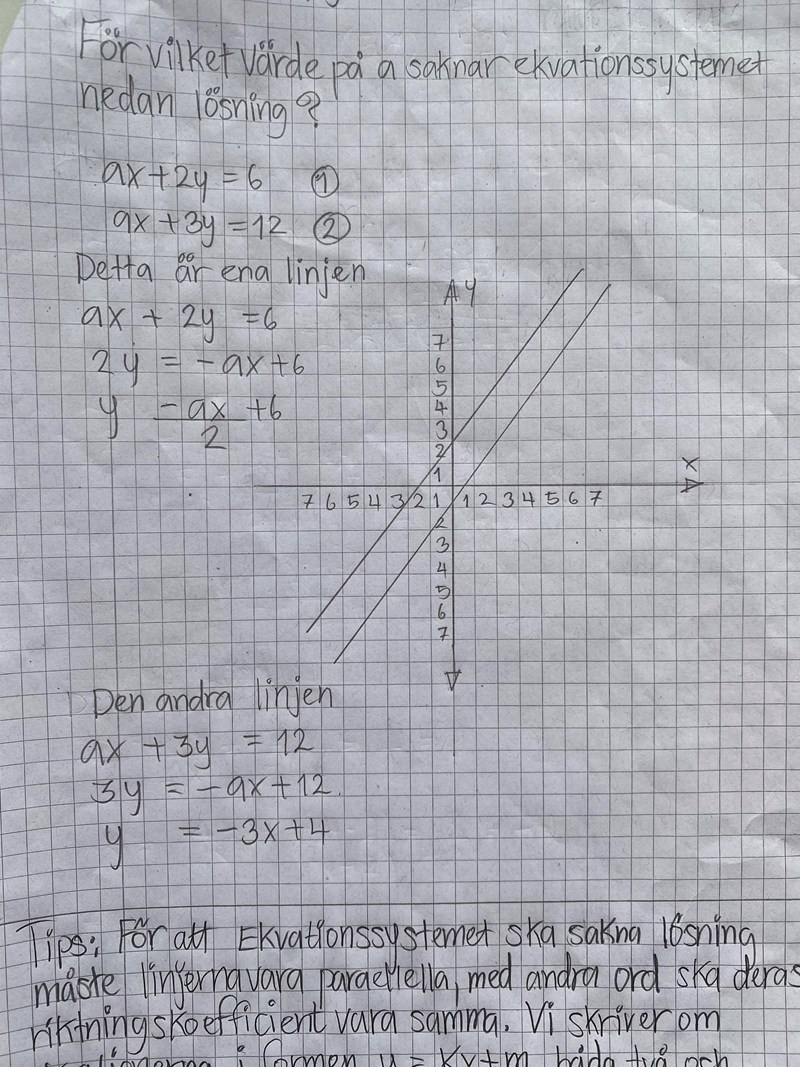 För vilket värde på a saknar ekvationssystemet nedan lösning? För att ekvationssystem ska sakna lösning måste linjerna vara parallella , med varandra med andra ord ska deras riktningskoefficient vara samma. Vi skriver om ekvationerna i form y = kx+m båda två och sätter deras lika
