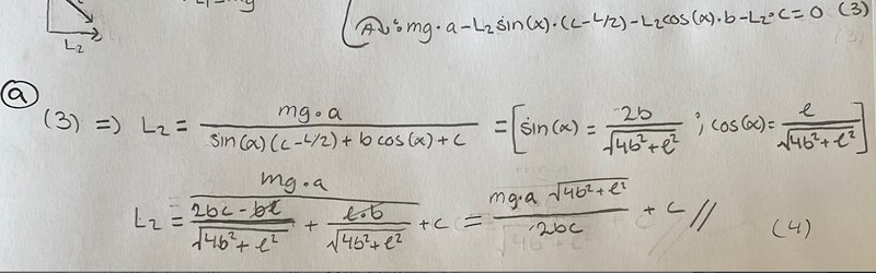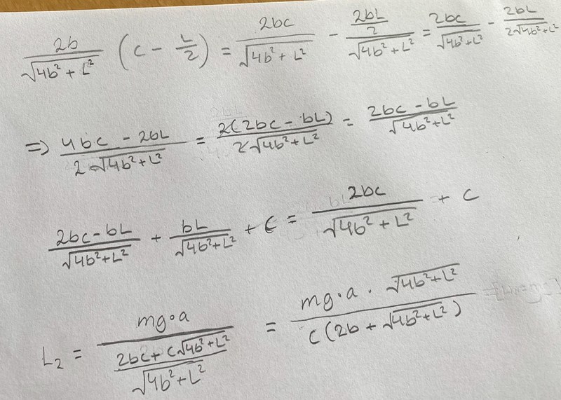 När man löser ut vad L2 blir så ska den sättas till L2=mg för att sendan lösa ut vad a/c blir. Stämmer denna uträkning av L2? Jag får inte ihop det sen när jag sätter L2=mg då jag inte kan lösa ut a/c? Kan det vara så att jag fick fel L2?