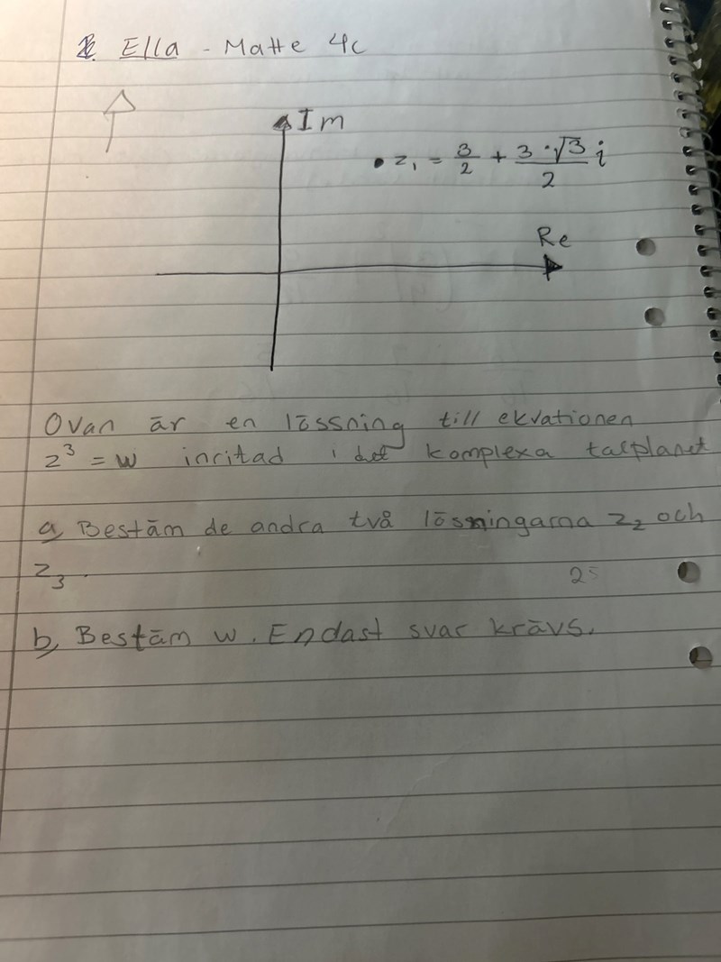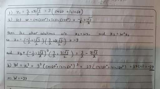 i a) skrev jag w = cos (120)+ i sin (120) men nu ser jag att det måste vara w = 3(cos (120) + i sin (120))