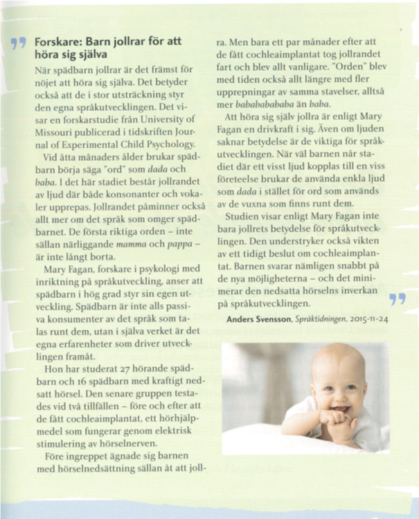 Senare i artikeln hänvisar Svensson till en studie på sambandet mellan jollrande vid tidig ålder och språkutvecklingen, utförd av Marie Fagans som är forskare i psykologi, inriktning språkutveckling.
