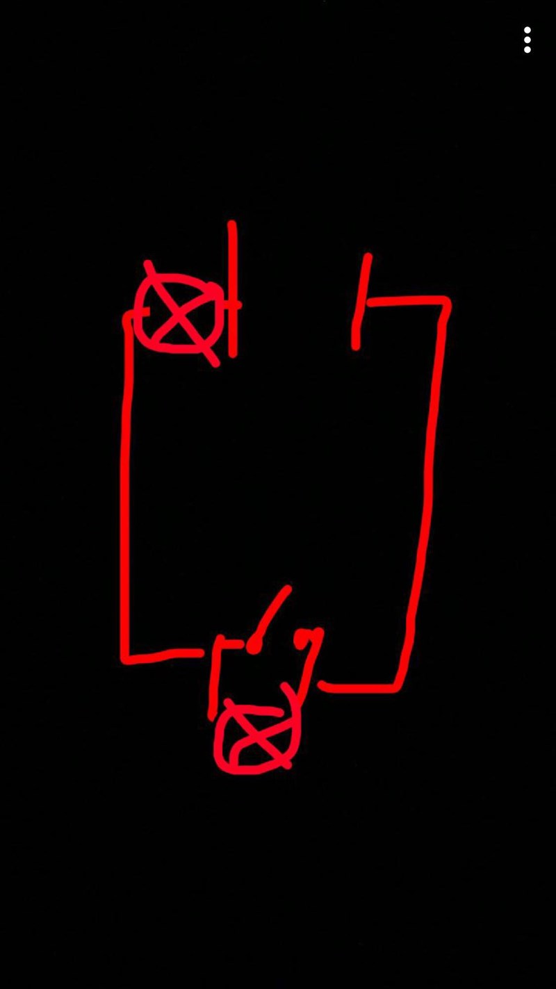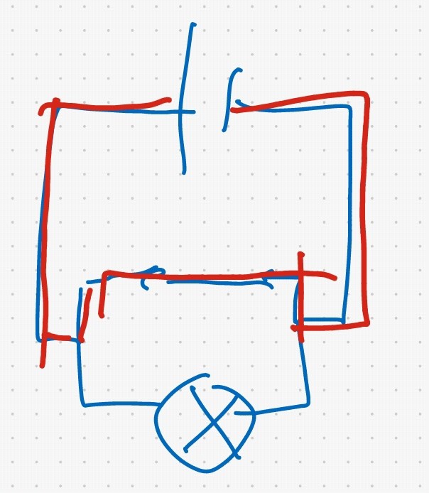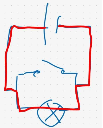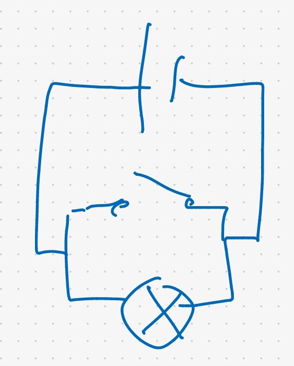 Jag vet att strömmen föredrar en speciell ledning och att då den andra lampan ej får energi, men jag kommer ej ihåg varför den valde en annan väg. Så då vet jag ej heller hur jag ska rita det.