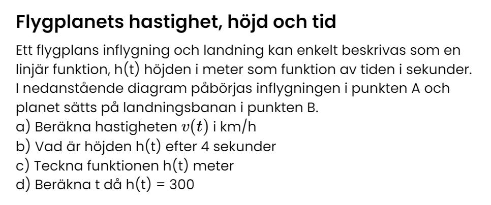 c) Om funktionen är y=kx+m så har du k-värdet från a (dock i enhet m/s). m-värdet är startvärdet då t=0, vad är det?