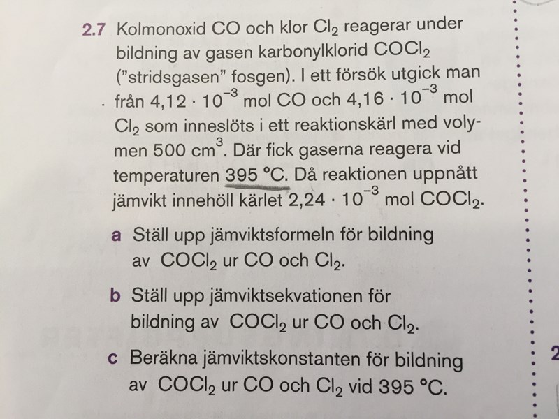 Det står i uppgiften att kärlet innehåller 2,24.10-3 mol fosgen vid jämvikt. Hur stor substansmängd finns det kvar av var och en av reaktanterna vid jämvikt?